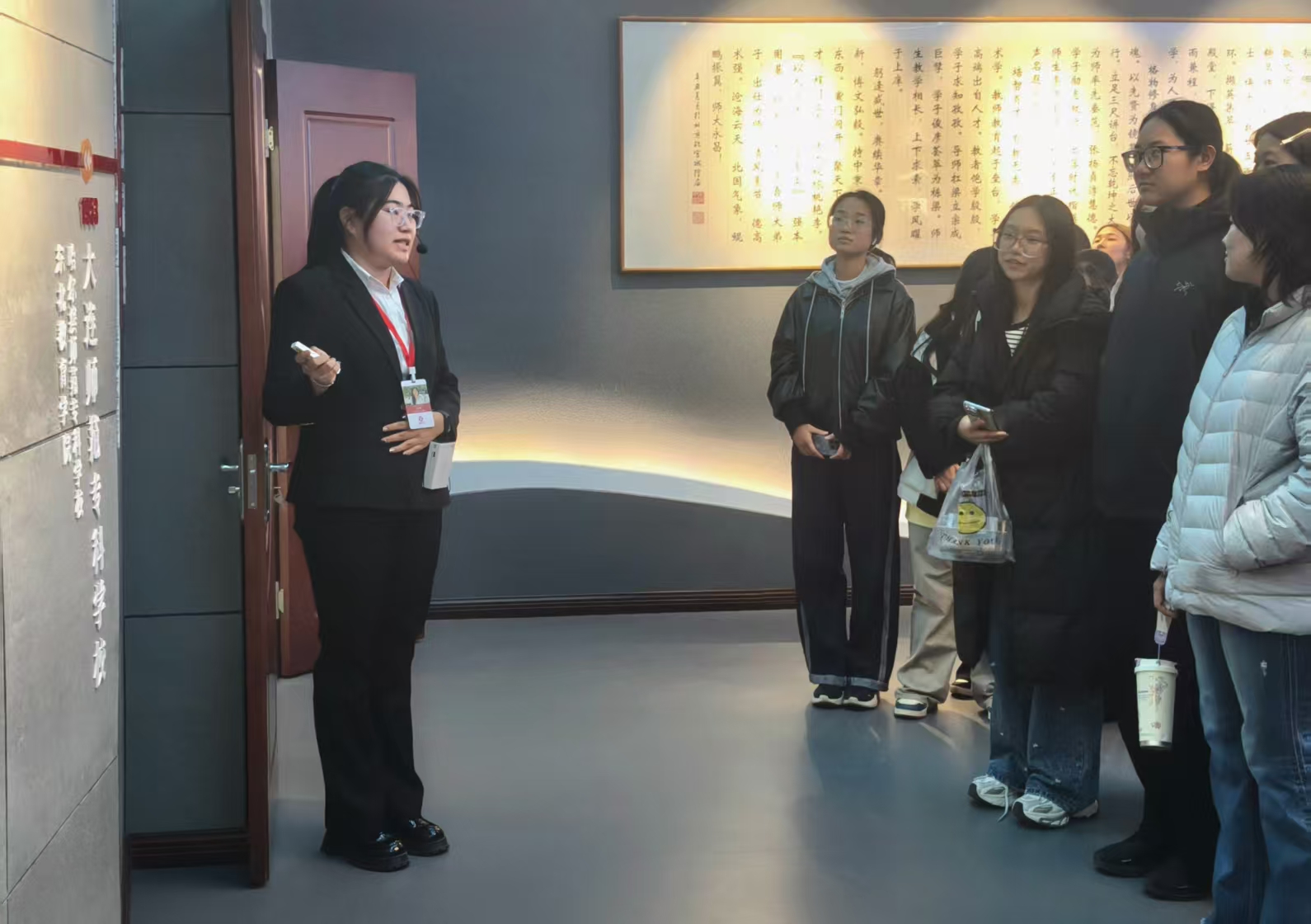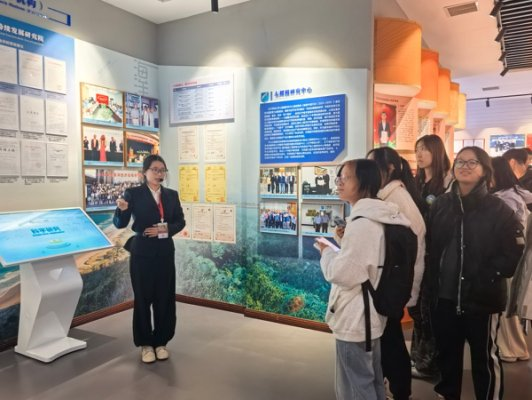 2025年11月26日,美术学院2025级本科生开展校史校情科普教育参观校史馆,校史文化宣传大使吴依蔓、张莫涵负责讲解。